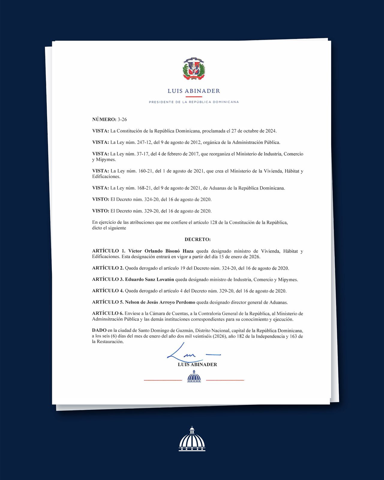 Santo Domingo, R.D.—El presidente de la República dispuso una nueva reconfiguración del tren gubernamental mediante el Decreto núm. 3-26, con el que fueron designados Eduardo “Yayo” Sanz Lovatón como ministro de Industria, Comercio y Mipymes; Nelson Arroyo como director general de Aduanas; y Víctor “Ito” Bisonó como ministro de Viviendas y Edificaciones. Las designaciones buscan fortalecer áreas estratégicas vinculadas al crecimiento económico, el comercio exterior y la política habitacional.