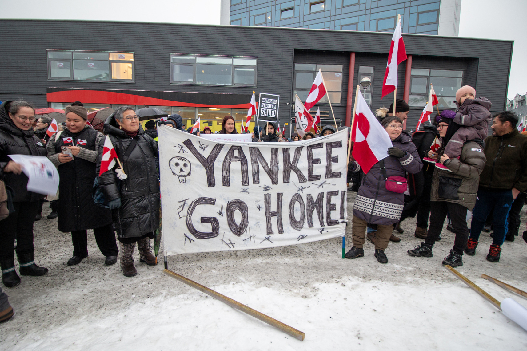 Entre las pancartas que llevaban los manifestantes abundaban las que incluían la frase que se ha convertido en el lema de la resistencia groenlandesa: Groenlandia no está a la venta. Pero también hubo carteles con mensajes como «Yankes, go home» («yanquis fuera») o «Nosotros decidimos nuestro futuro».