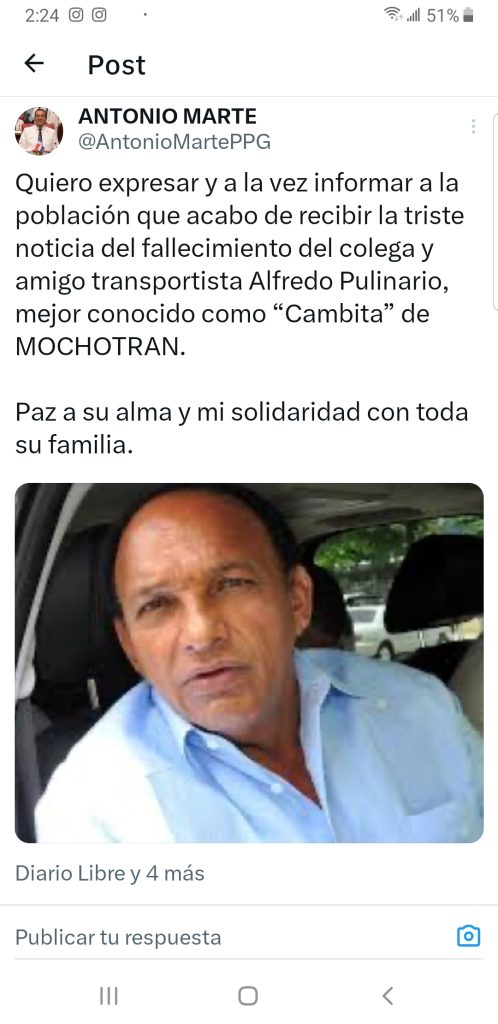 “Quiero expresar y a la vez informar a la población que acabo de recibir la triste noticia del fallecimiento del colega y amigo transportista Alfredo Pulinario, mejor conocido como “Cambita” de MOCHOTRAN. Paz a su alma y mi solidaridad con toda su familia”, indicó Marte.