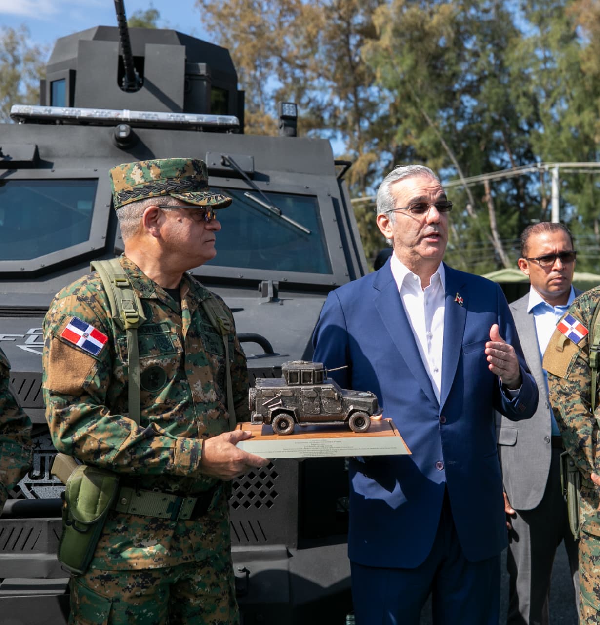 El mandatario realizó además la entrega formal de tres vehículos blindados FURIA modelo VBD-1, los primeros modelos de vehículos blindados ensamblados por la Industria Militar Dominicana, marcando un hito en el desarrollo de la capacidad industrial de defensa del país y fortaleciendo las unidades especializadas de las Fuerzas Armadas.