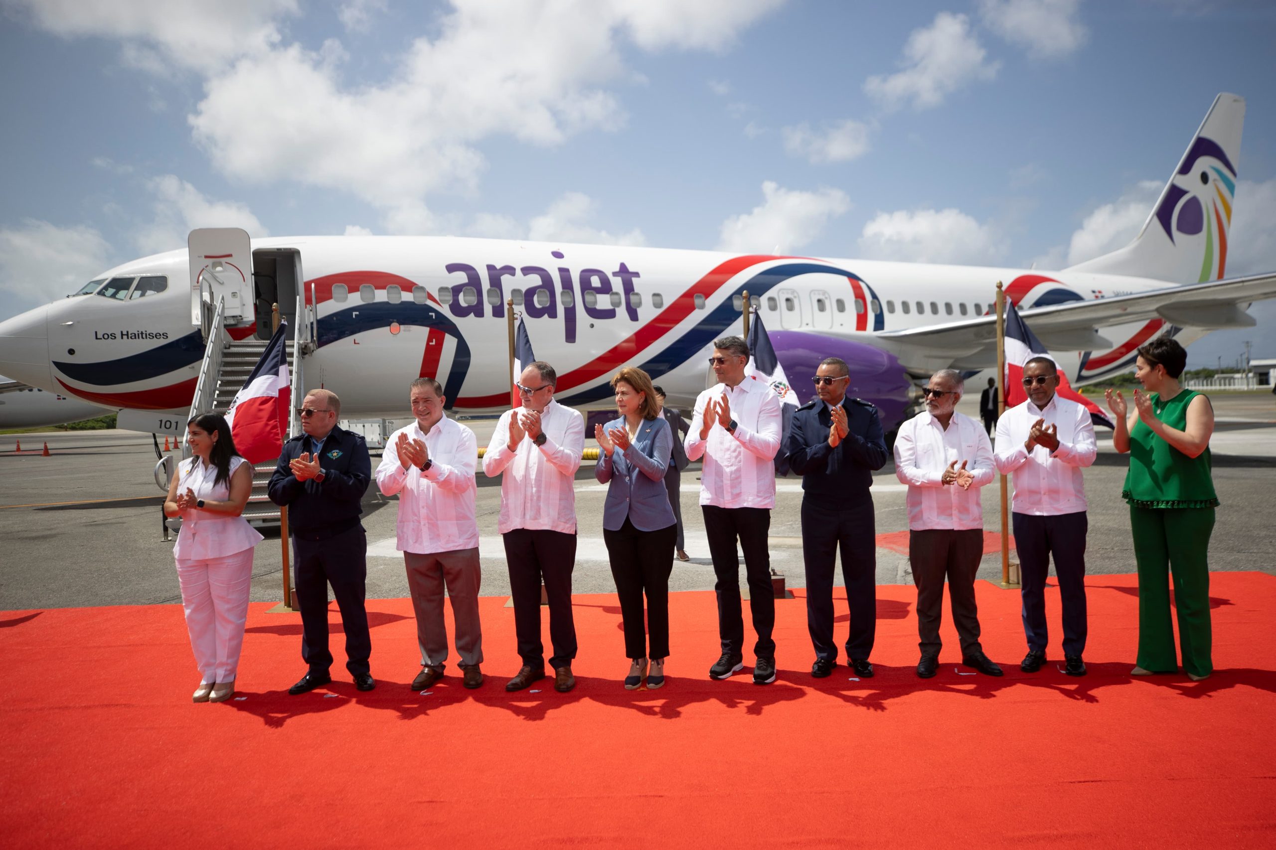 El acto de recibimiento estuvo encabezado por la vicepresidenta de la República Raquel Peña, junto a Víctor Pacheco Méndez, CEO y Fundador de Arajet, así como el presidente de Boeing para América Latina, Landom Loomis, entre otros funcionarios, representantes de inversionistas y ejecutivos de la empresa.